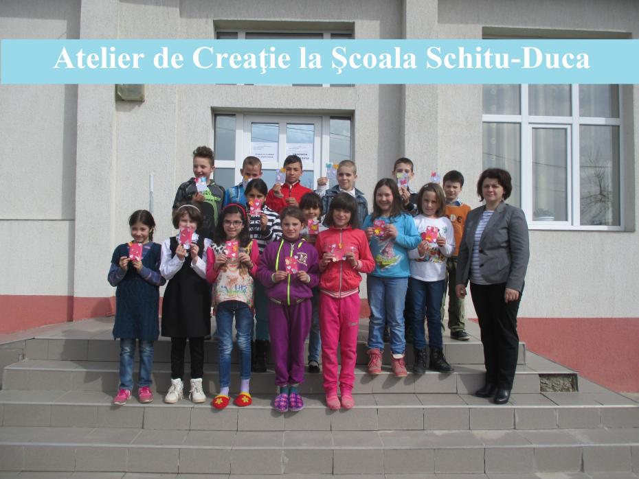 Parohia „Adormirea Maicii Domnului“ Schitu-Duca continuă colaborarea cu „Şcoala Gimnazială Poieni, Locaţia Schitu-Duca“ sub forma unui nou proiect de parteneriat în cadrul căruia vor fi organizate o serie de ateliere creative până la sfârşitul anului şcolar 2015-2016. Joi 10 martie copiii de la grădiniţă, clasa pregătitoare şi clasa a III-a au realizat felicitări folosind carton colorat/ decorat, burete dublu adeziv şi autocolant auriu.